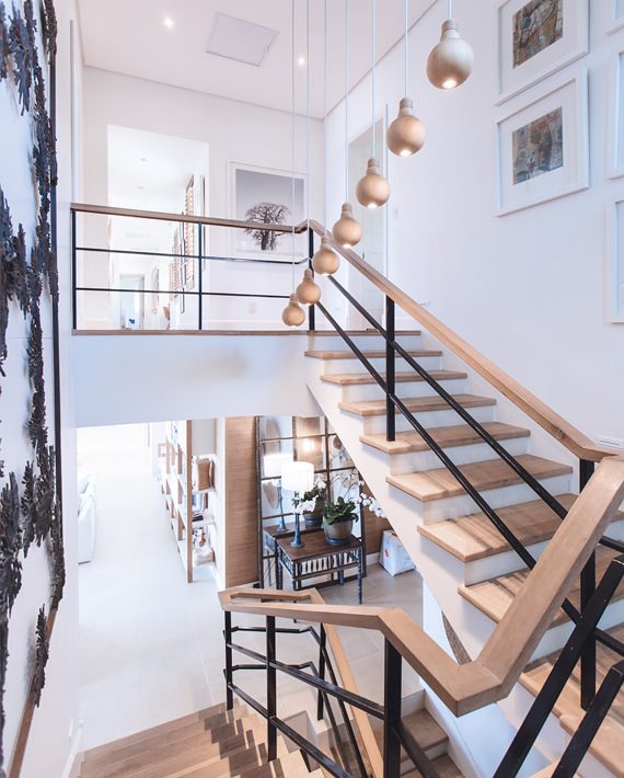 Açık plan yerleşimi, yaşam alanlarını birbirine akıcı bir şekilde bağlıyor. Merdiven boyunca uzanan dekoratif aydınlatmalar ve duvar sanatları güçlendiriyor. Modern çizgilerle birleşerek hem davetkâr hem de sofistike bir atmosfer oluşturuyor.